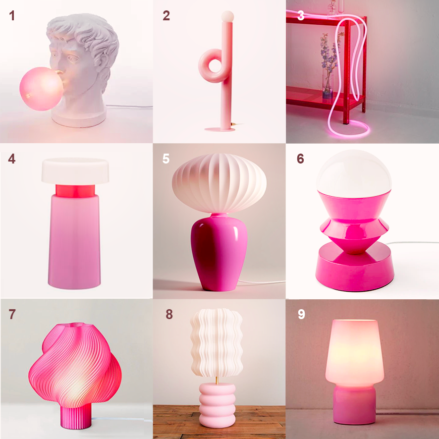 /1. “Wonder times” - ici /2. “Petite modulation” - Axel Chay, ici /3. “Flex tube” - ici /4. “Lampe de table” - Maisons du monde, ici /5. “La Meringue” - Bureau Benjamin, ici /6. “Lampe” - Jean-Pierre Garrault pour Monoprix, ici /7. “Soft Serve Lamp - Sorbet Pink” - ici /8. “Champignon ondulé Audrey” - Made by Morii, ici /9. “Little glass table lamp” - Urban outfitters, ici
