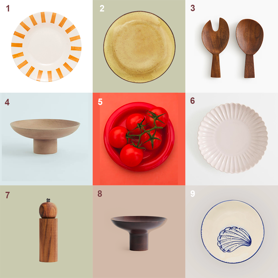 /1. Assiette plat “CHERI” - La Redoute, ici /2. Assiette “Verre bullé” - Madame Stoltz, ici /3. Couverts à salade “Manguier” - H&M Home, ici /4. Coupe à fruits “Bol” - H&M Home, ici /5. Assiette à dessert “Rouge” - Monoprix, ici /6. Assiette creuse “Cérame” - H&M Home, ici /7. Moulin à épices - H&M Home, ici /8. Bol de service sur pied - H&M Home, ici /9. Assiette à dessert “Coquillage” - Bouchara, ici